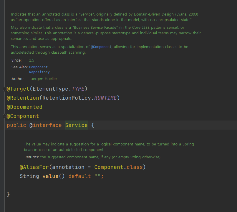 @Service에 @Component가 달려 있으므로, 스프링 내부에서 자동으로 Bean 등록이 가능하다.