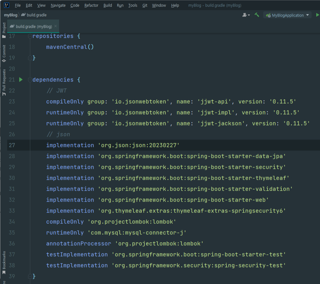 이를 확인하기 위해 build.gradle 파일에 가서 보면 생성시에 추가한 의존성이 명시되어 있는 것을 볼 수 있습니다.