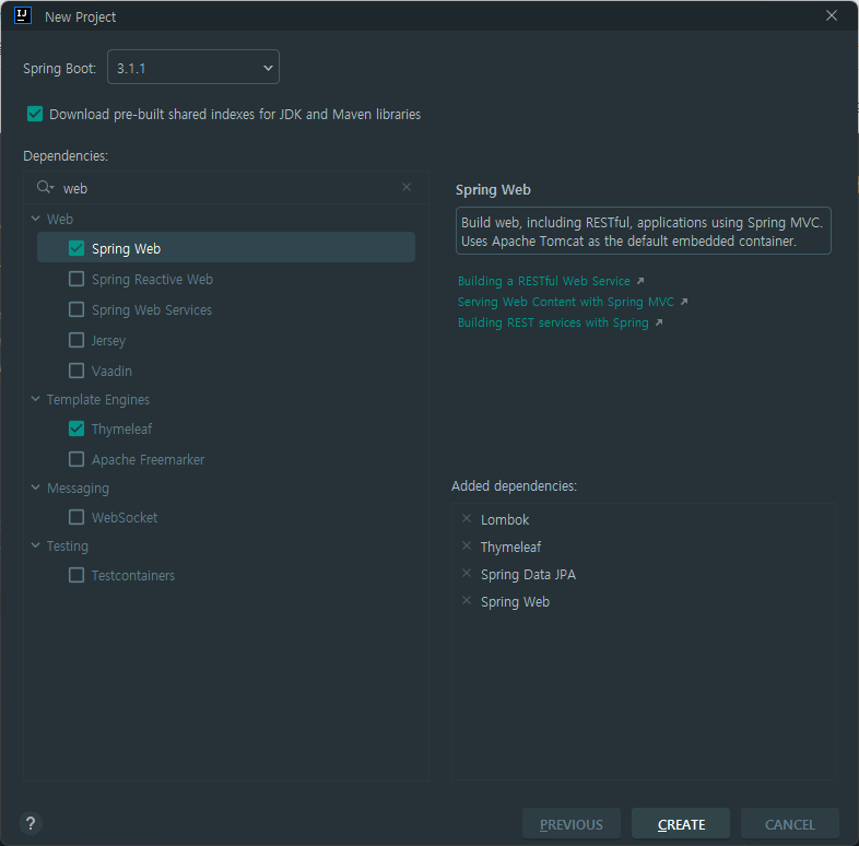 아래와 같이 프로젝트를 새로 생성하는 과정에서 의존성을 손쉽게 추가할 수 있습니다.