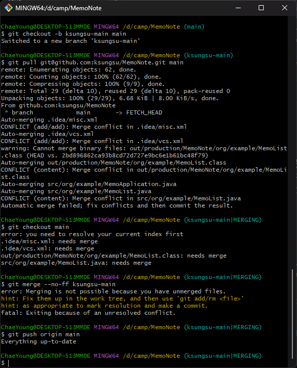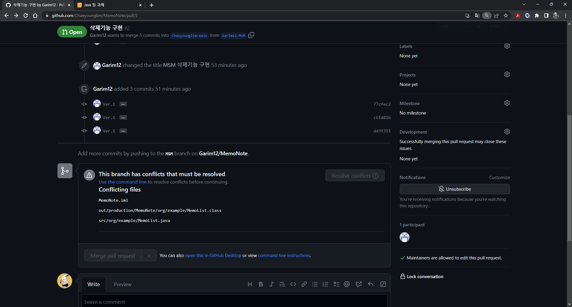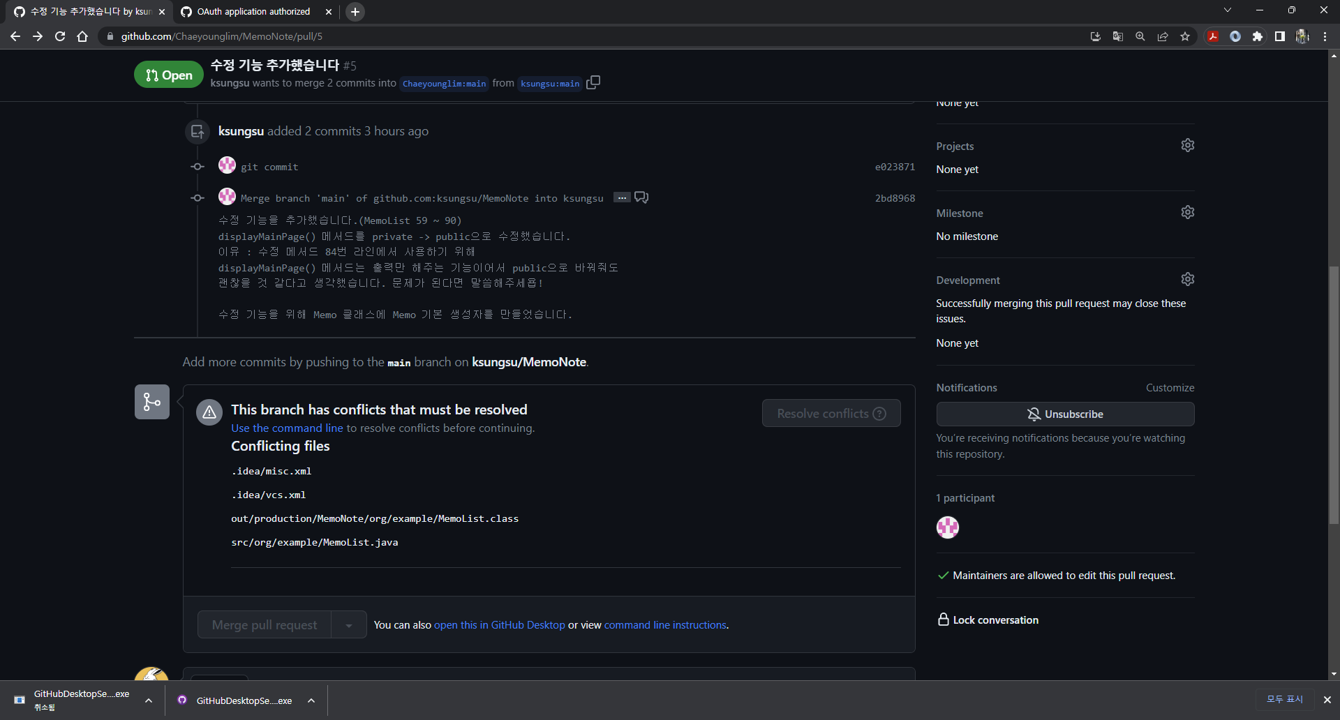 그러므로 브랜치를 생성해서 가져온 후에 충돌을 해결하고 해당 브랜치에 해결한 부분을 push하고,