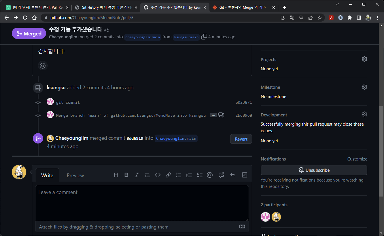 그러면 github에서 병합이 되었다는 것을 확인할 수 있다.