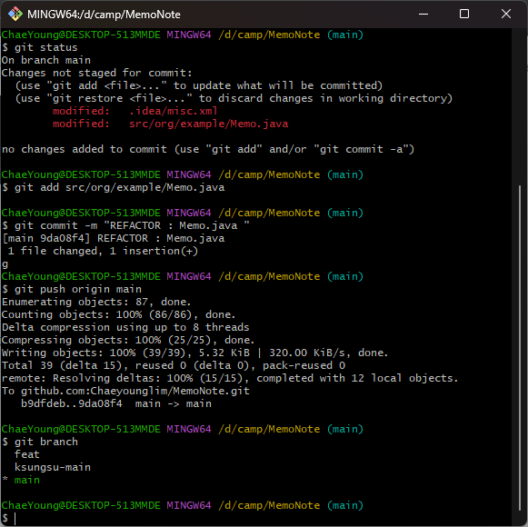 그 후 main으로 checkout을 한 후에 main에 병합할 브랜치명을 기재해서 병합한다.
