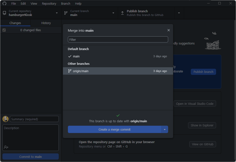 main으로 head를 이동하여 생성한 브랜치를 main에 병합시키면 된다.