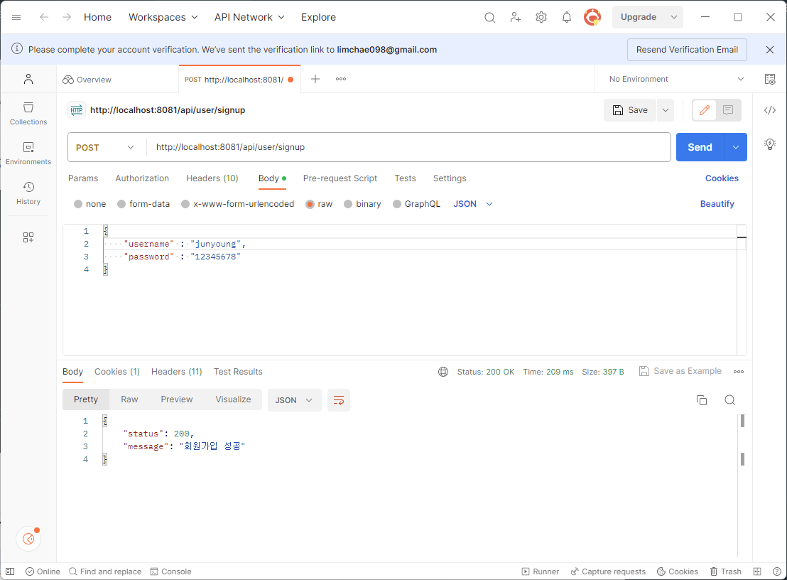- DB에 중복된 username이 없다면 회원을 저장하고 Client 로 성공했다는 메시지, 상태코드 반환하기